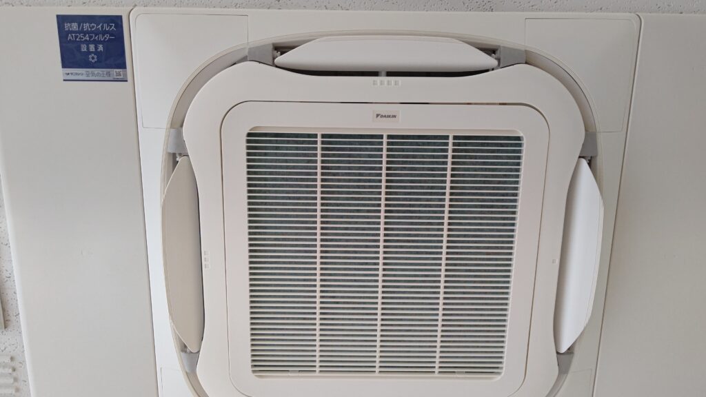 店内や備品について紹介していきます。本日はエアコン当店ではエアコンに感染症対策の一環で抗菌、坑ウィルス効果のあるフィルターを設置して使用しております。